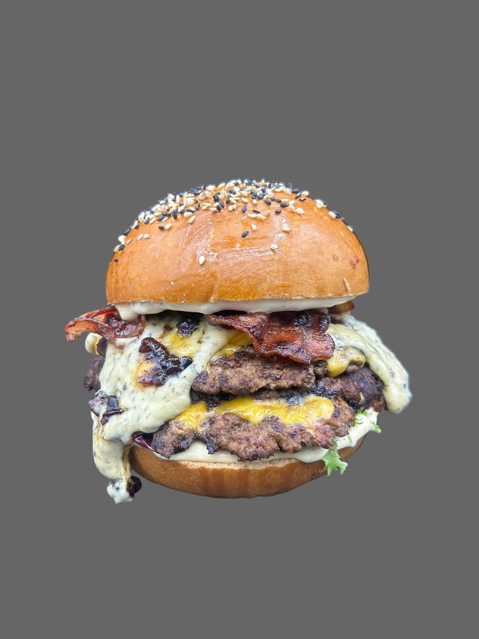 3 X 75g viande hachée boeuf( CH), triple cheddar aux truffes, confiture de bacon, bacon grillé, sauce maison, salade