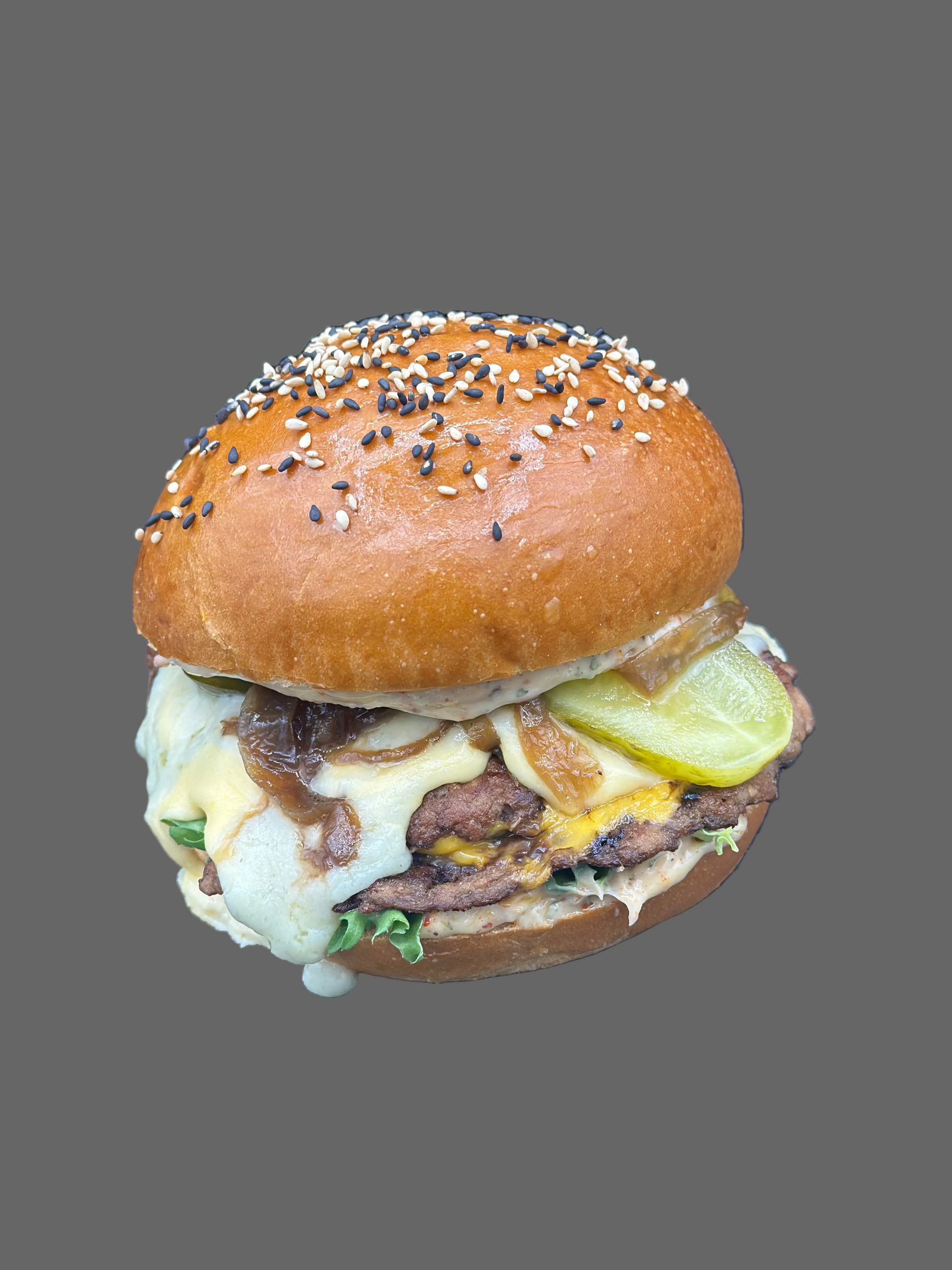 2 X 75g viande hachée boeuf ( CH ), triple cheddar, oignons caramélisés, sauce gorgonzola, salade, cornichons.